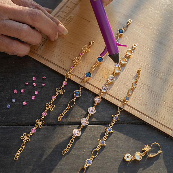 Our jewelry bases are made of a unique combination of soldered stone settings, earring findings, cup chains & decorated metal elements.