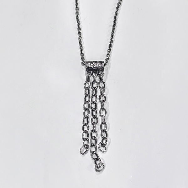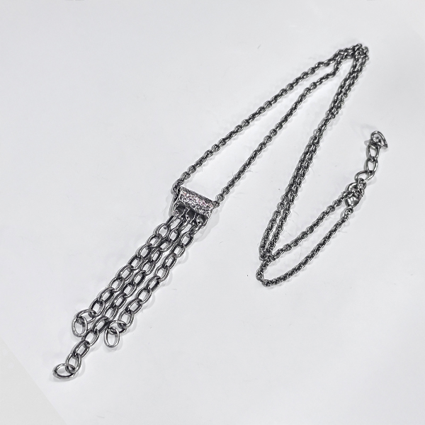 Almost finished dainty oval chain with Metal casting hammered tube element with dangling chains